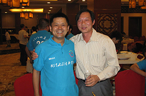 王雅南于10月1日凌晨两点半到达武汉并赶往聚会同学下榻的梨园大酒店。杨茜蓉,吴汉涛及儿子同机抵达,彭卉,谢长彦和儿子及父母也稍后抵达。韩增山和陈洪前往迎接大部队。陈文军自己赶到了中午大家进餐的电力宾馆。下午,孙扬波从郑州驱车到达武汉,第一次参加聚会的甘以迈也乘高铁从广州赶来。孙红江也赶到了晚宴的所在地小观园餐厅(原水院教工食堂)。至此全班已到了21人,宴开3席,方宏庄老师也从百忙之中抽出时间赶来和大家团聚。杜逊则把晓亮和新娘子直接带到了会场。饭后每位同学都领到了印有自己学号的班服并进行了“有惩知识问答”。除了毛维东,杜逊,宏梅和杨茜蓉四位评委以外,每个同学都抽到一个问题,所有问题的答案均来自网上的论坛。很多同学由于上论坛时间不多,很多问题都答不上来,为此可没少喝酒。当被问到451班的神雕侠侣是谁时,杜逊和宏梅被要求照图片上的姿势演示一遍时,聚会达到了高潮。