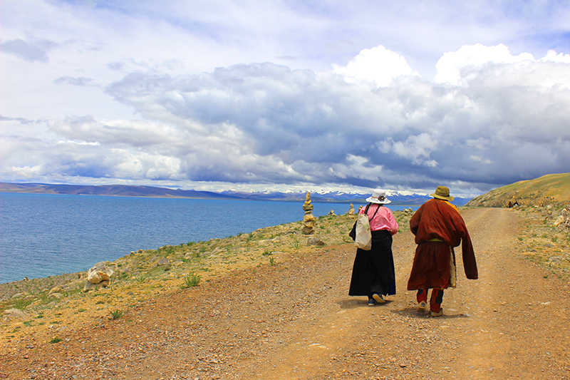 早晨离开拉萨时阴着天,一路向北去纳木错。因为限速,240公里路程跑了近4小时,翻越了海拔5190m的那根拉山口。纳木错是西藏三大圣湖中最出名的,湖面海拔4718m。中午达到纳木错扎西岛时阴云密布,湖边全是骑牦牛拍照的人,高原的风吹得人冷嗖嗖。我们绕扎西岛转了一圈,5公里路走了近2小时,在海拔4800m的地方转山,是不小的挑战。幸运的是天晴了,我们在阳光和蓝天白云下沿着湖边接受心灵的洗涤。