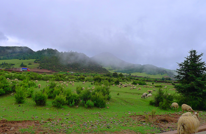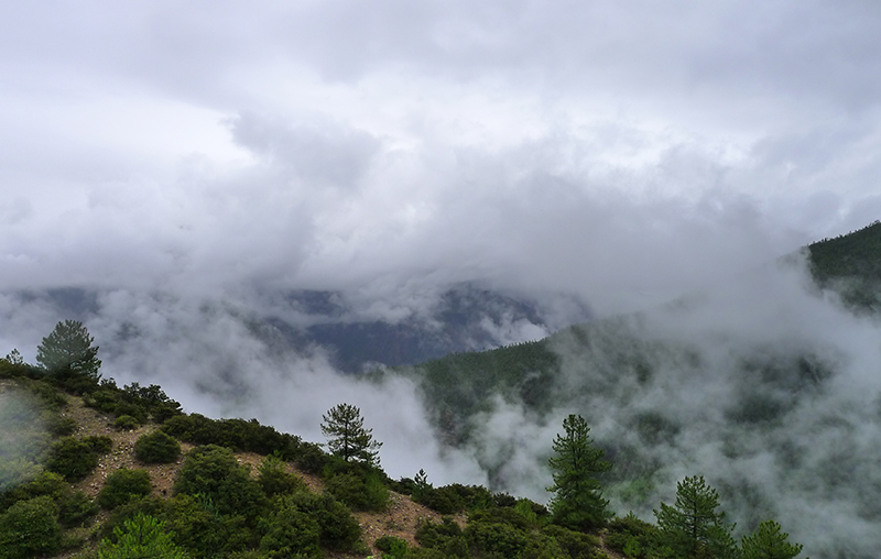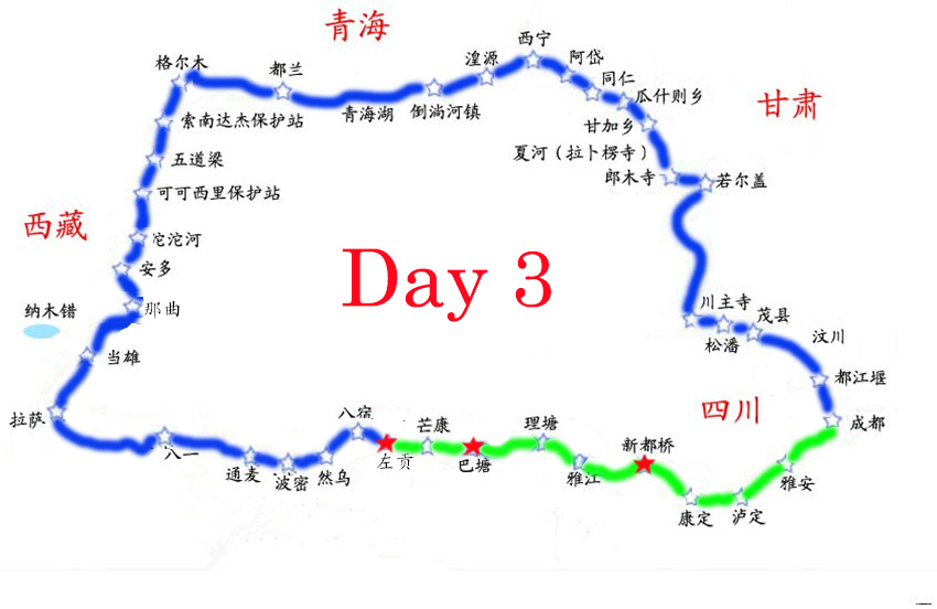 第三天总算是正式进入西藏了,但是很多地方没有信号,无法上网及发短信。竹巴龙到芒康一段70公里的海通沟是318上两处最危险的路段之一,沿途随处可见山上滚落的石头。我们还遇上了泥石流,眼看着石头往下滚,大伙趁着路被阻断之前冲了过去,非常顺利地通过险境。今天爬过了三座大山, 4179米的宗巴拉山、4338米的拉乌山和5008米的东达山。东达山风景最美,可几千米高的悬崖就在身边也太吓人了,我手心的巧克力都化成了巧克力奶。只有这时才对高反失去了感觉,恐惧战胜了高反。据说开车通过东达山的司机这辈子不会再惧怕任何山路了。当晚在左贡住宿,本来海拔就高,有3750米,还给安排在了四楼,更可恨的是居然没有电梯,爬到二楼大家就已经要瘫软在地了。上了楼就再也不想下去了。